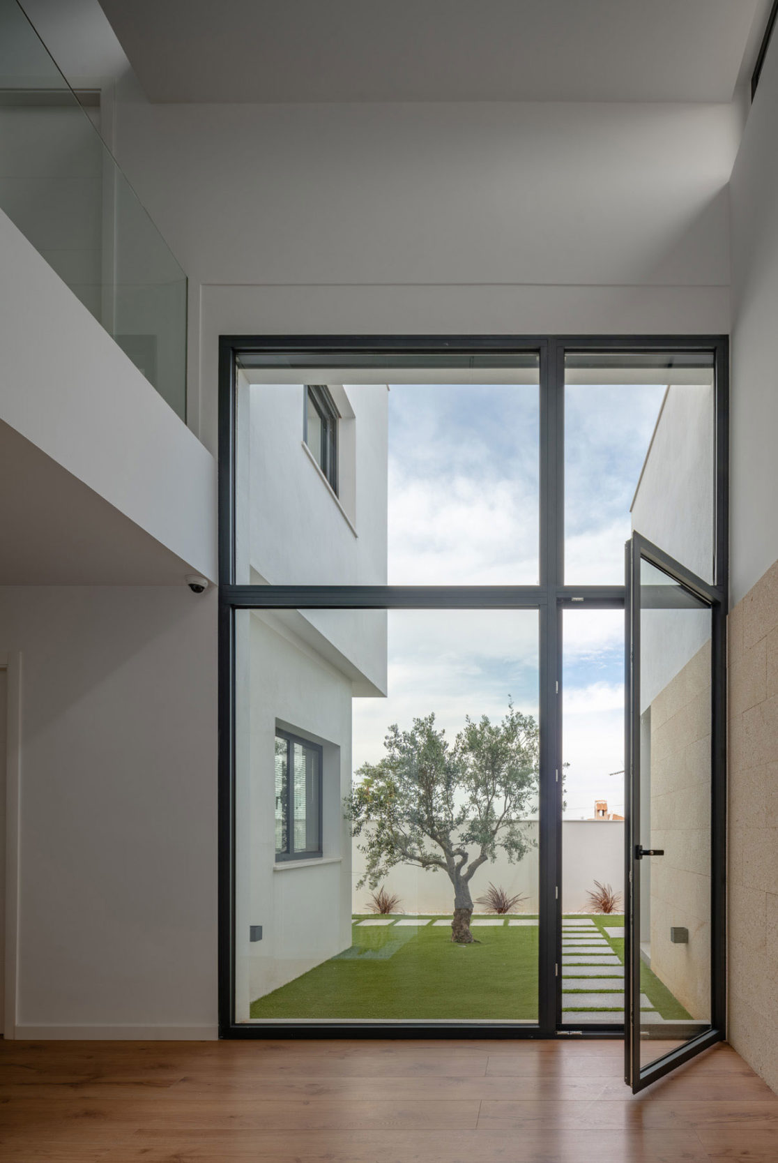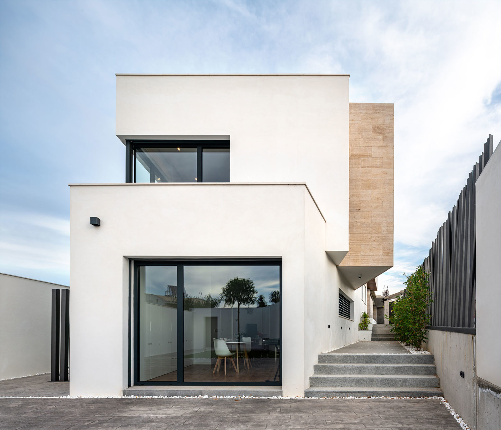 La zona de día se compone de cocina-comedor con despensa y salón comedor, ambos espacios con salida directa a zona exterior protegida con voladizos y lamas de hormigón.