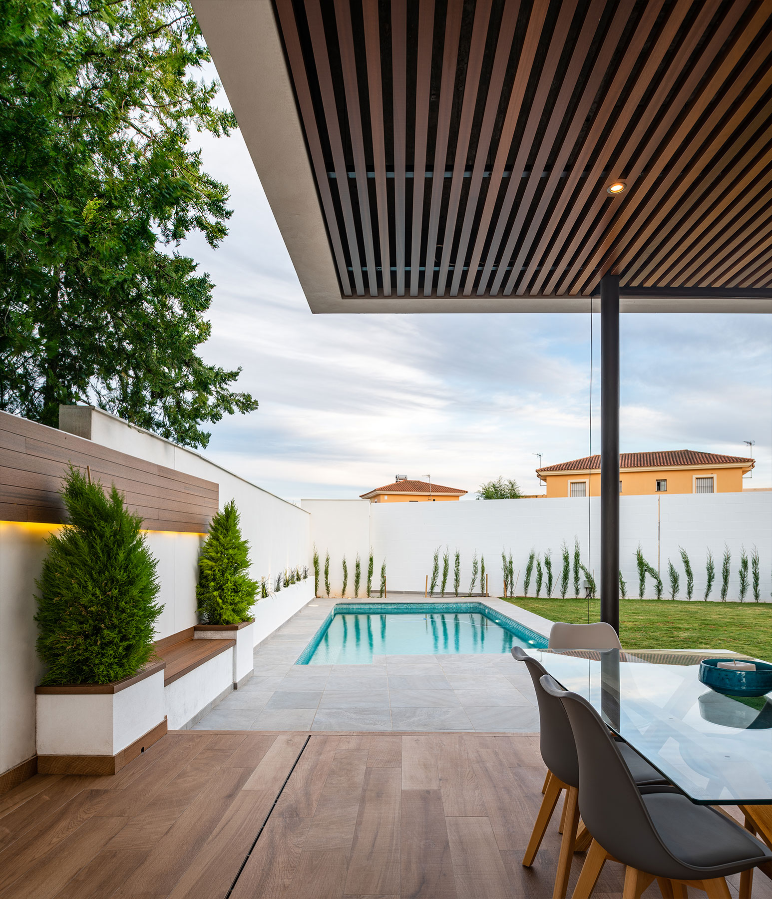 La vivienda contará con zonas exteriores en todo el perímetro de la vivienda que tendrá un tratamiento solado en su totalidad, a excepción de la zona sur, entre la piscina y el aparcamiento y una pequeña área en la zona norte de la parcela.